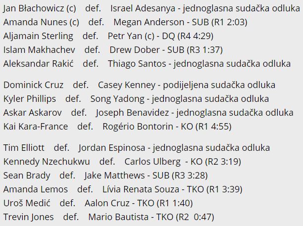Spomenimo još kako je Amanda Nunes nastavila svoju dominaciju, već u prvoj rundi je zaustavila svoju protivnicu Megan Anderson i još jednom potvrdila da je najbolja borkinja koja je ikada koračala oktagonom. Brazilska borkinja nema konkurenciju, jednostavno je predominantna i užitak je gledati kako sve svoje protivnice ‘razbije’ bez većih problema.