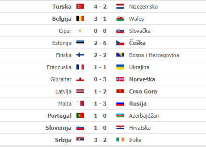 Belgija je, unatoč tome što je gubila 1:0, očekivano opravdala ulogu favorita protiv Belgije i na kraju slavila 3:1 pogocima De Bruynea, Hazarda i Lukakua. Portugal je teže od očekivanog slavio protiv Azerbajdžana 1:0, s time da su si gosti sami zabili pogodak, dok je Norveška s glatkih 3:0 preskočila gostovanje na Gibraltaru.